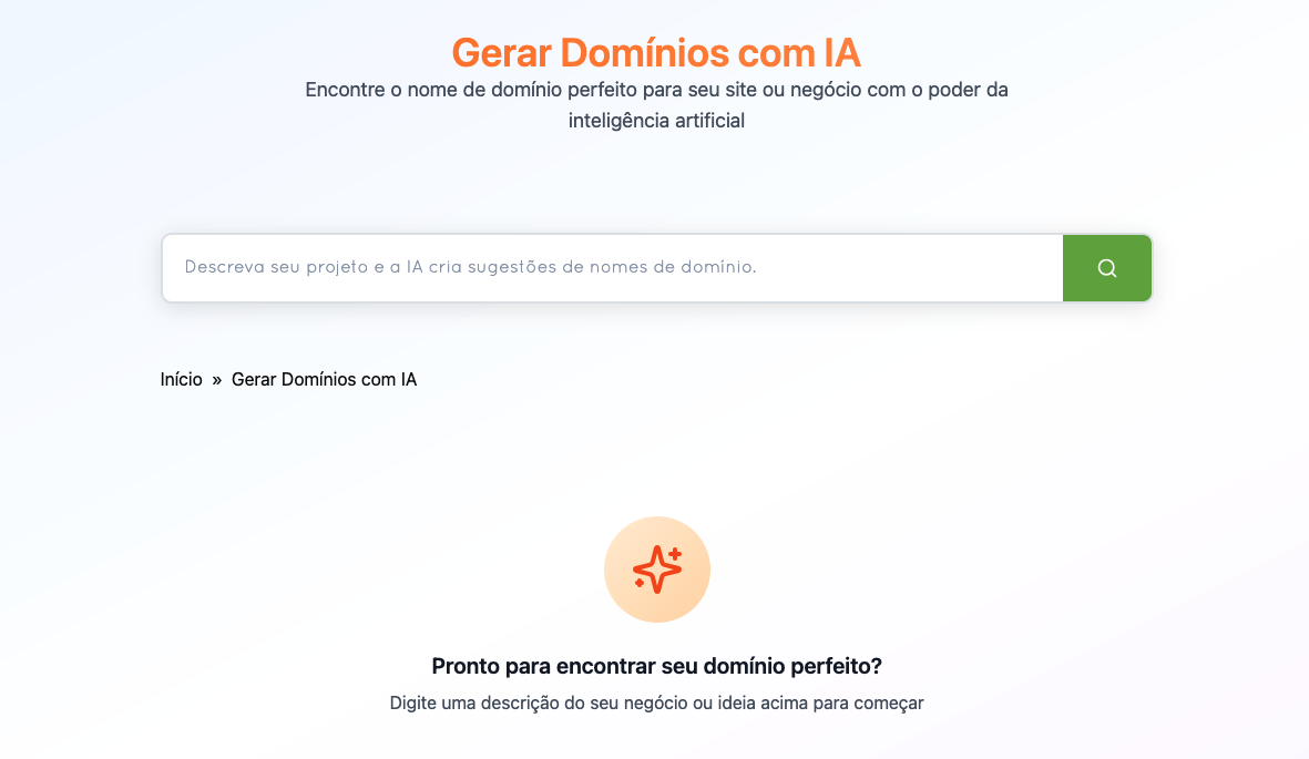 Temos o prazer de anunciar uma nova ferramenta exclusiva em nossa plataforma: o Gerador de Domínios com IA! Esta ferramenta inovadora utiliza inteligência artificial para ajudá-lo a encontrar o nome de domínio perfeito para seu negócio ou projeto.