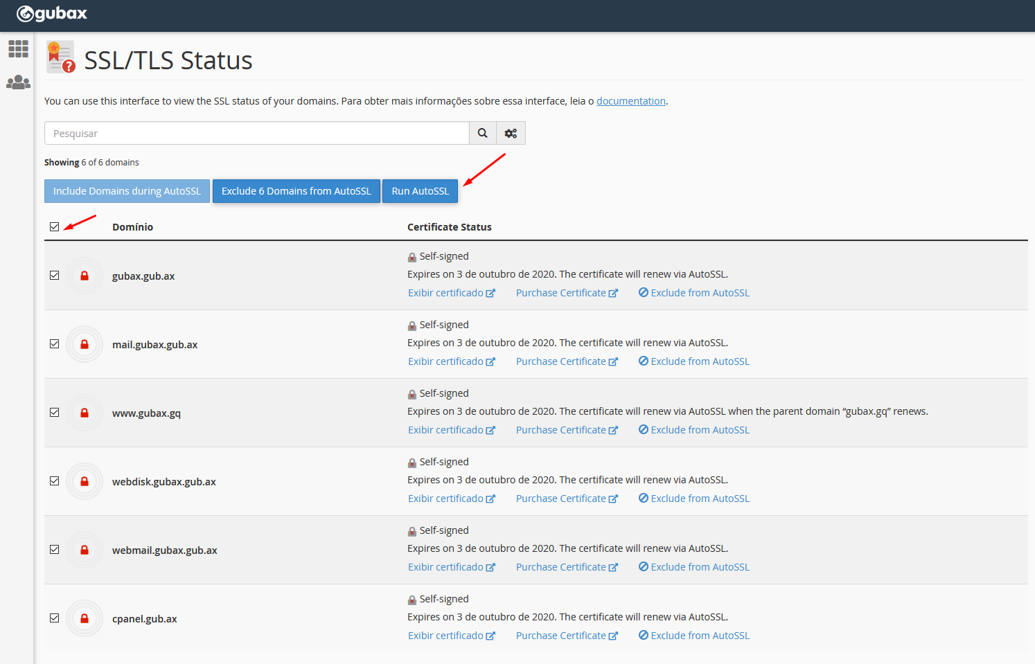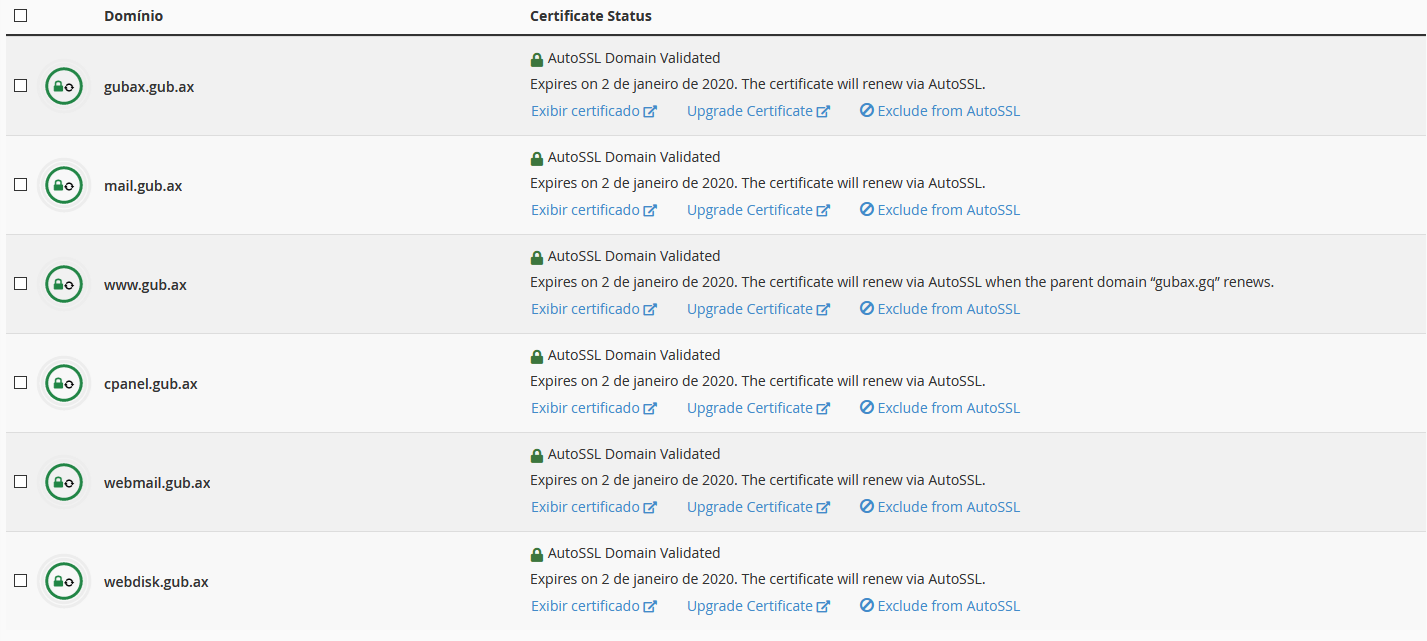 Todos os campos selecionados ficarão com o Status AutoSSL Domain Validated.