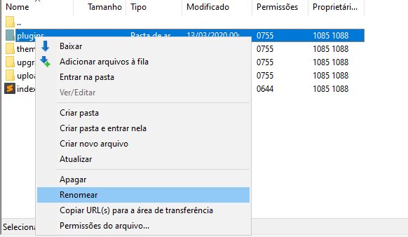 Sabendo disso, agora retorne ao diretório wp-content e renomeie novamente sua pasta de plugins como estava anteriormente.