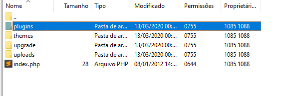 Em seguida, será necessário desativar cada um dos plugins até descobrir o culpado. Para fazer isso, abra o diretório wp-content/plugins e realize o mesmo procedimento anterior de renomear pasta por pasta.