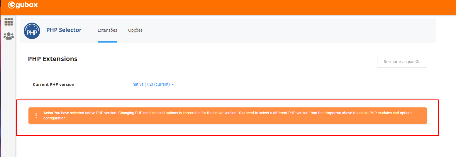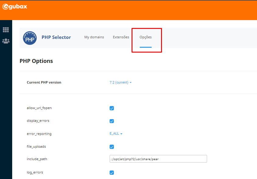 Faça login no seu cPanel e navegue até a opção Selecionar Versão do PHP –> Opções ou Switch to PHP Options: