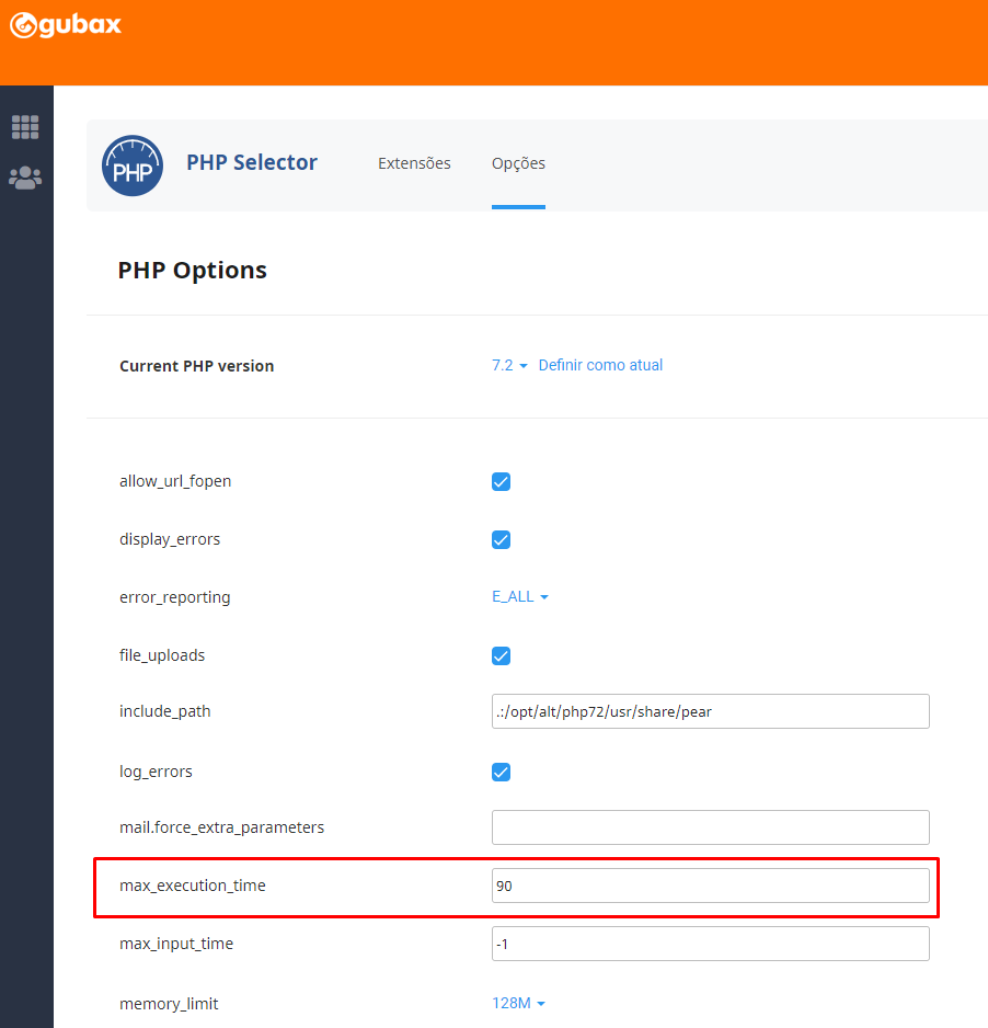 Dentro dessa opção, clique na aba Opções Localize a linha max_execution_time, e clique sobre o valor atual para editar.