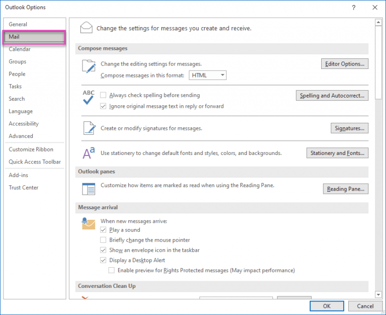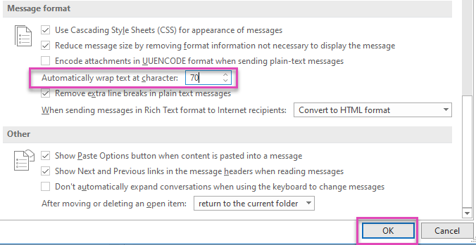 Em Quebra automática de texto no caractere, insira um número para indicar onde você deseja que o Outlook envolva o texto. Mantenha isso entre 65 e 70 caracteres.