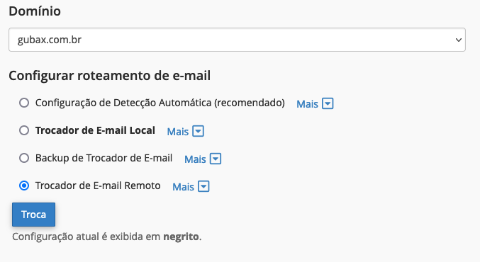 Após adicionar todas as entradas do Google Workspace, vá na opção Roteamento de e-mail dentro cPanel, selecione marque Trocador de E-mail Remoto e salve.