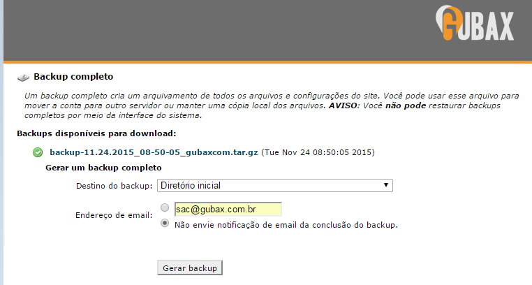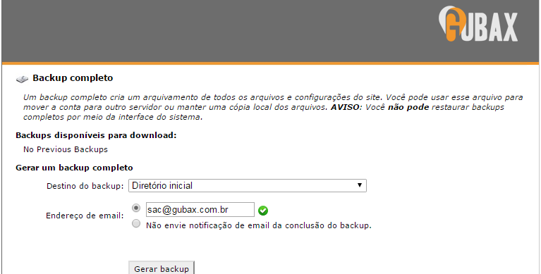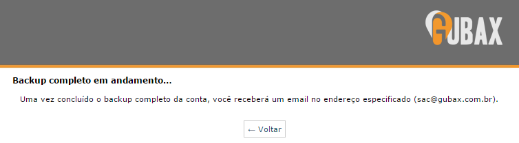 Endereço de E-mail: Se deseja receber uma notificação por e-mail da conclusão do backup preencha seu e-mail, caso não queira receber a notificação selecione a opção "Não enviar mensagem de notificação de conclusão do backup."